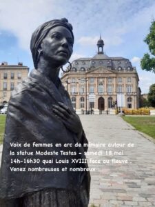 Collectif « Voix de femmes » (avec des femmes rassemblant les associations AFMD33, Fédération française des clubs de l’Unesco de la Nouvelle Aquitaine, Kalina’Go, Dalonaz maloya, et leurs ami.e.s). Ce collectif a spontanément été créé après l’inauguration de la statue de Modeste Testas et lui est intrinsèquement lié. Créé par des femmes rejointes aussi par des hommes, il entend faire entendre la voix des femmes dans l’histoire et ses mémoires