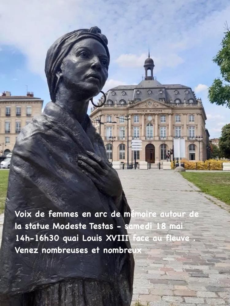 COMMUNIQUÉ : Événement artistique et mémoriel bilingue dans différents créoles et d’autres langues (maorais, malgache, espagnol cubain, mexicain, péruvien, yoruba, peul, éwé, portugais brésilien, etc) et en français aux pieds de la statue de Modeste Testas née Al Pouessi, quai Louis XVIII côté fleuve (arrêt tram CAPC), en arc de mémoire autour d’elle. Dans le cadre des Journées de la mémoire de l’esclavage, de ses traites et de leurs abolitions, organisées par la Ville de Bordeaux