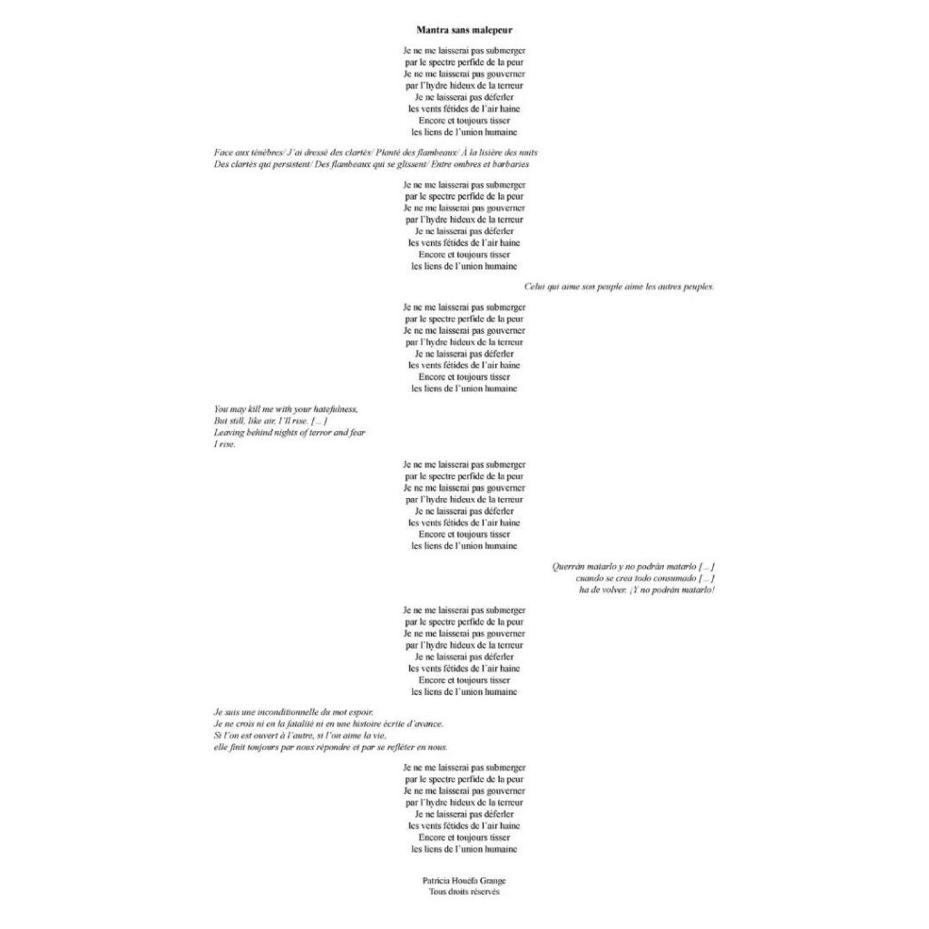 … de la tornade à la brise, en passant par un mantra sans malepeur. Ce dernier reprend en italique des mots de (dans l’ordre d’apparition) :