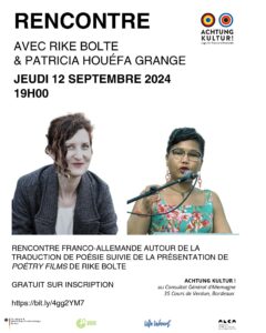 Petit rappel, ce soir 12/09 19H00, aura lieu la rencontre entre les deux poétesses et traductrices RIKE BOLTE et PATRICIA HOUÉFA GRANGE.