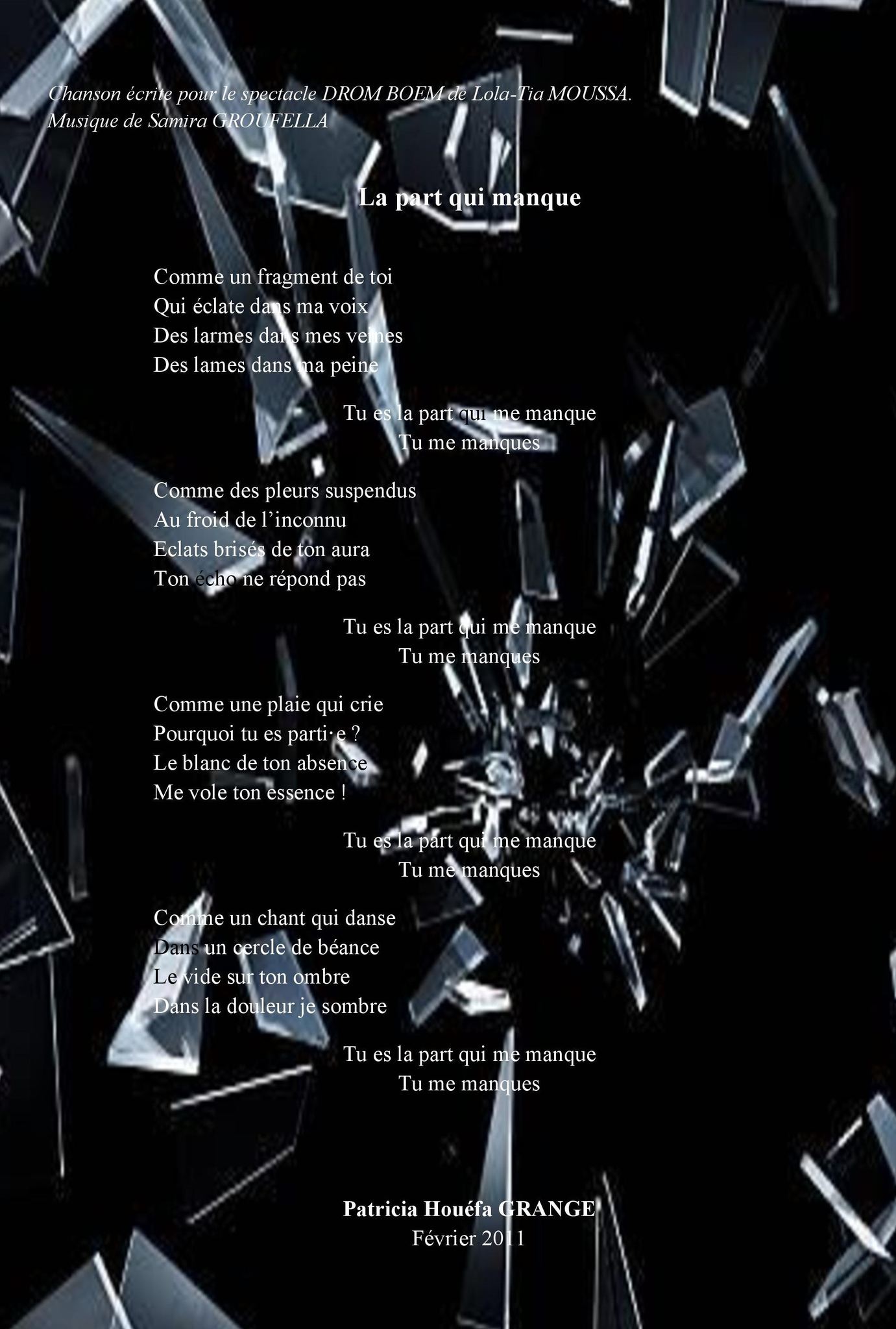 Cela m’a donné envie de partager avec vous le texte d’une chanson que j’ai écrite il y a plus de dix ans, sur commande, accompagnée de la musique de Samira Groufella dans le cadre d’un projet de Lola-tia Moussa et Aleksandra Mostowski, « Drom Boem ». C’était une chanson qui évoquait un être cher disparu et que j’ai intitulée « La part qui manque ». Cette part qui manque peut aussi bien être un être cher, qu’un pays, une culture, une langue, une part de soi.