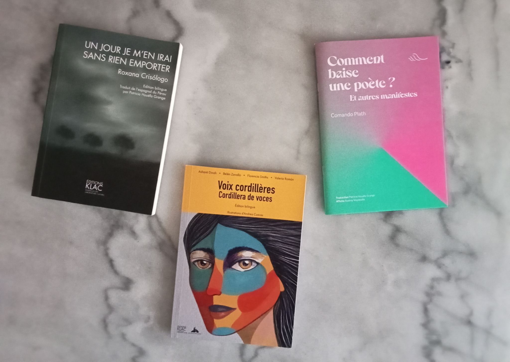 • Un jour je m’en irai sans rien emporter, recueil poétique de Roxana Crisólogo Correa, traduit de l’espagnol (Pérou) et publié par les éditions KLAC: en mars 2024