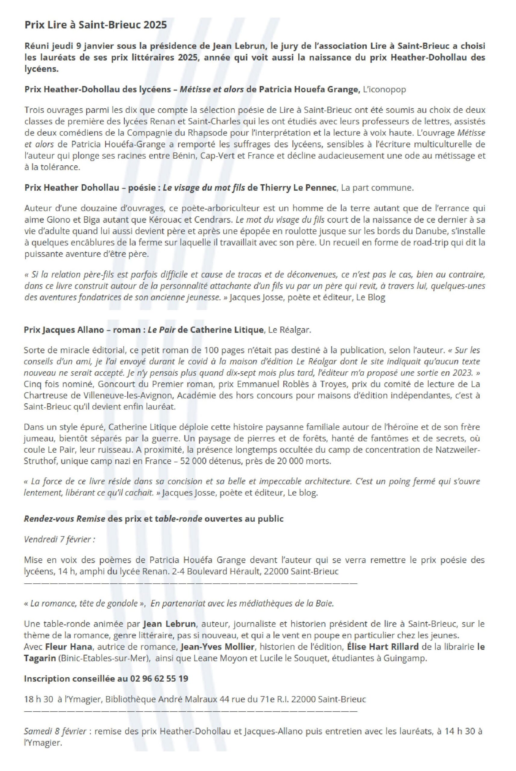 Je suis tellement touchée, heureuse et honorée que mon livre reçoive cette belle distinction du Prix Heather Dohollau des Lycéens 2025 dans le cadre des Prix Littéraires de Lire à Saint-Brieuc.