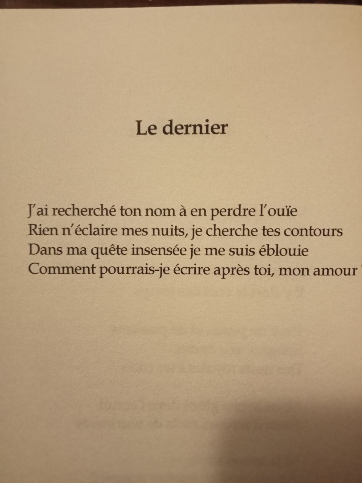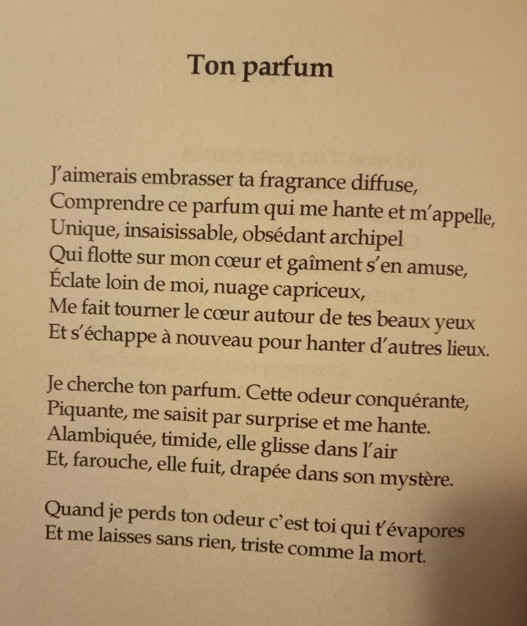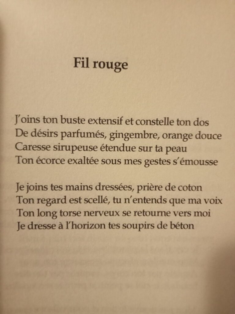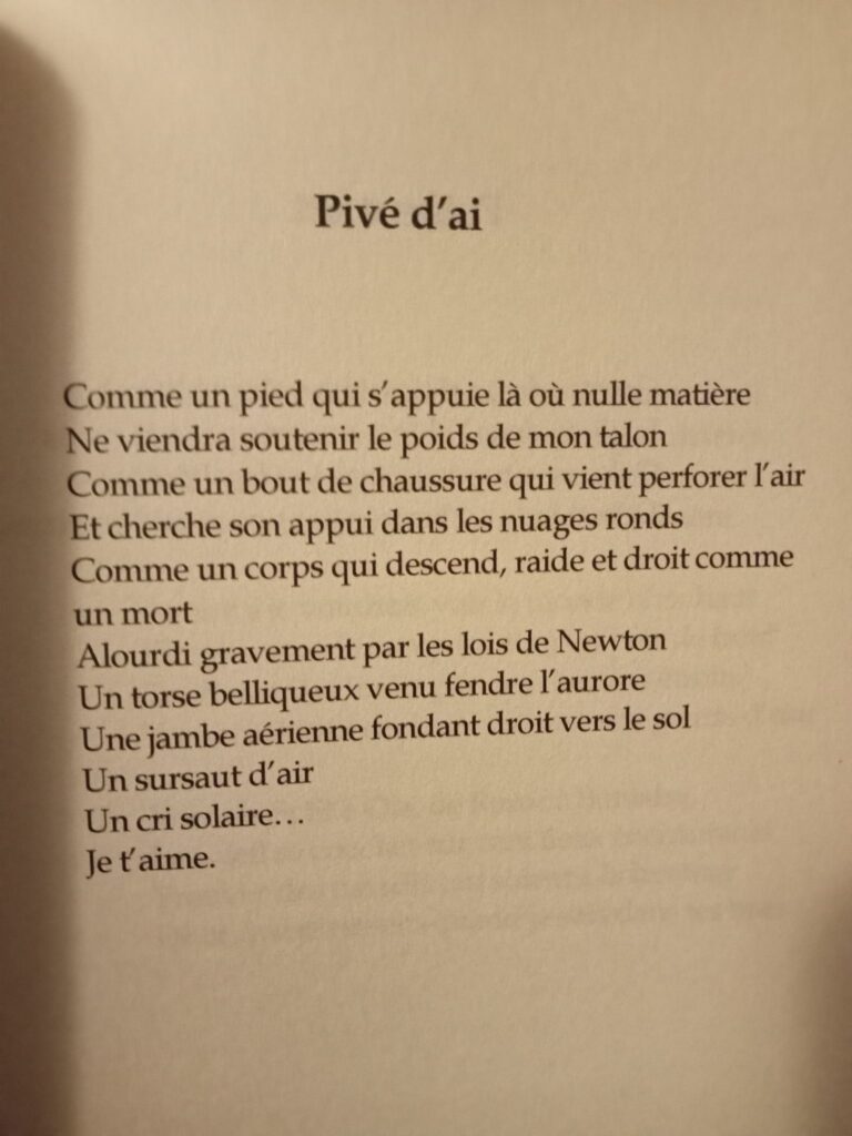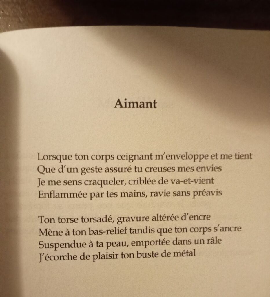 Cela donne un bel ensemble de textes à la veine classique et aux accents contemporains, avec des clins d’œil ici et là à Baudelaire notamment, et quelques jeux à la fibre oulipienne. L’ouvrage est classé en quatre parties liées aux éléments : Feu (de la rencontre), Air (de l’élévation et lévitation), Eau (des plaisirs de la sensualité) et Glace (du désamour).