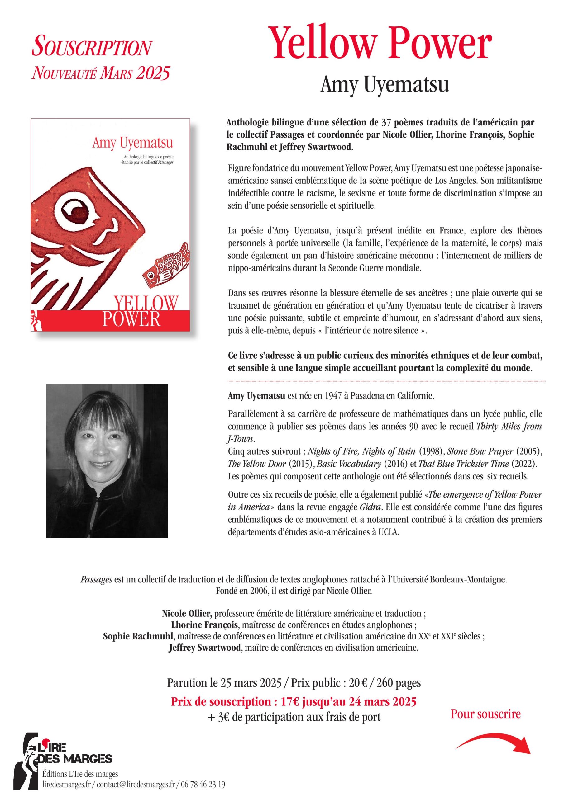 YELLOW POWER, une anthologie bilingue de poésie d’Amy Uyematsu, coordonnée par Nicole Ollier, Lhorine François, Sophie Rachmuhl et Jeffrey Swartwood, traduite par le collectif Passages.