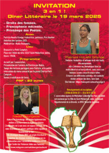 Comme annoncé il y a quelques jours dans mon programme du mois de mars, nous avons rendez-vous mercredi 19 mars à 19h30, à la brasserie Le Petit Comptoir à Saint Médard en Jalles, pour un dîner littéraire organisé par l’Agence de médiation culturelle des pays du Sahel, dans le cadre de la journée internationale de la francophonie.