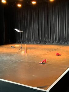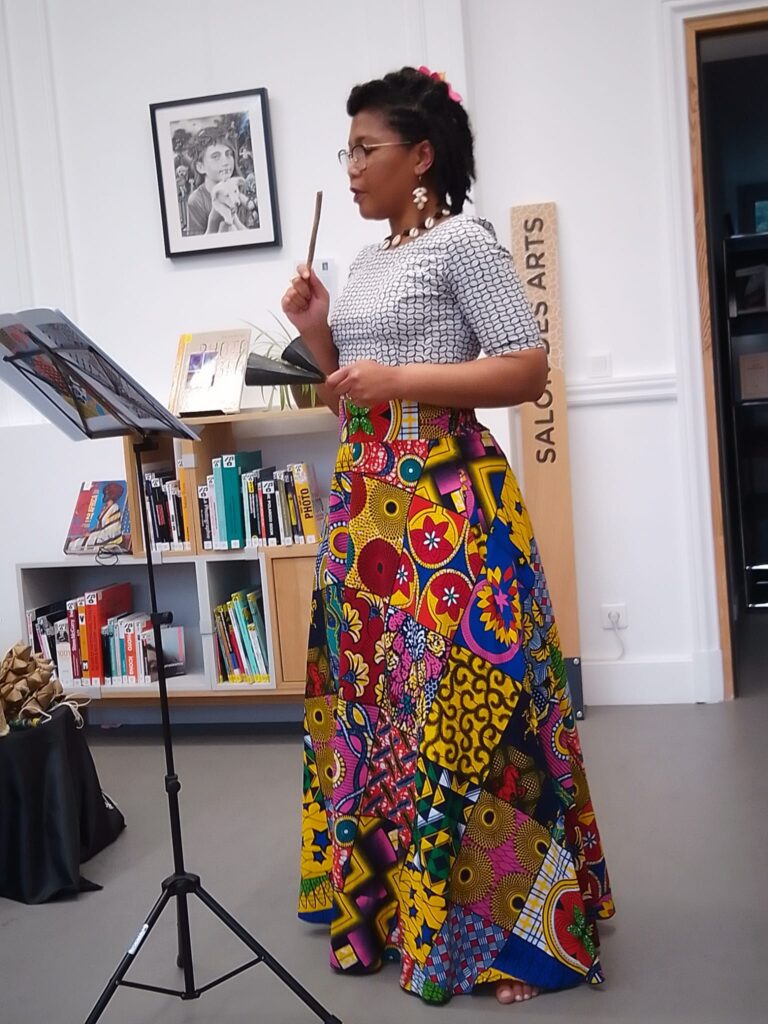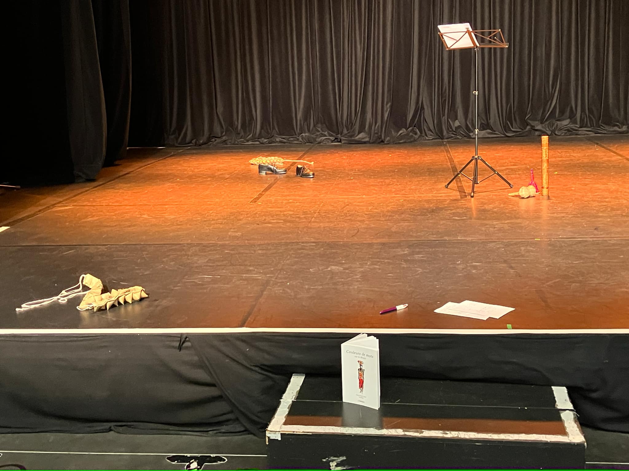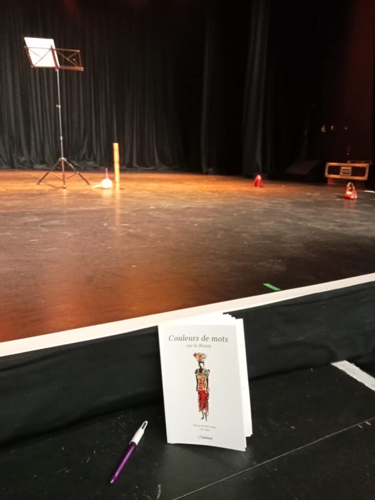 La semaine dernière, Soraya Bénac et moi avons été accueillies en résidence pendant deux jours à l’Espace Simone Signoret à Cenon pour créer une forme scénique courte qui mêle poésie à voix haute, claquettes & autres petites percussions, à destination du jeune public. Cette création est basée sur des poèmes issus du recueil Couleurs de mots sur le Bénin que j’avais imaginé en complicité avec l’aquarelliste Guy Papin, et s’intitule « A petits pas…des couleurs de mots se dansent ».