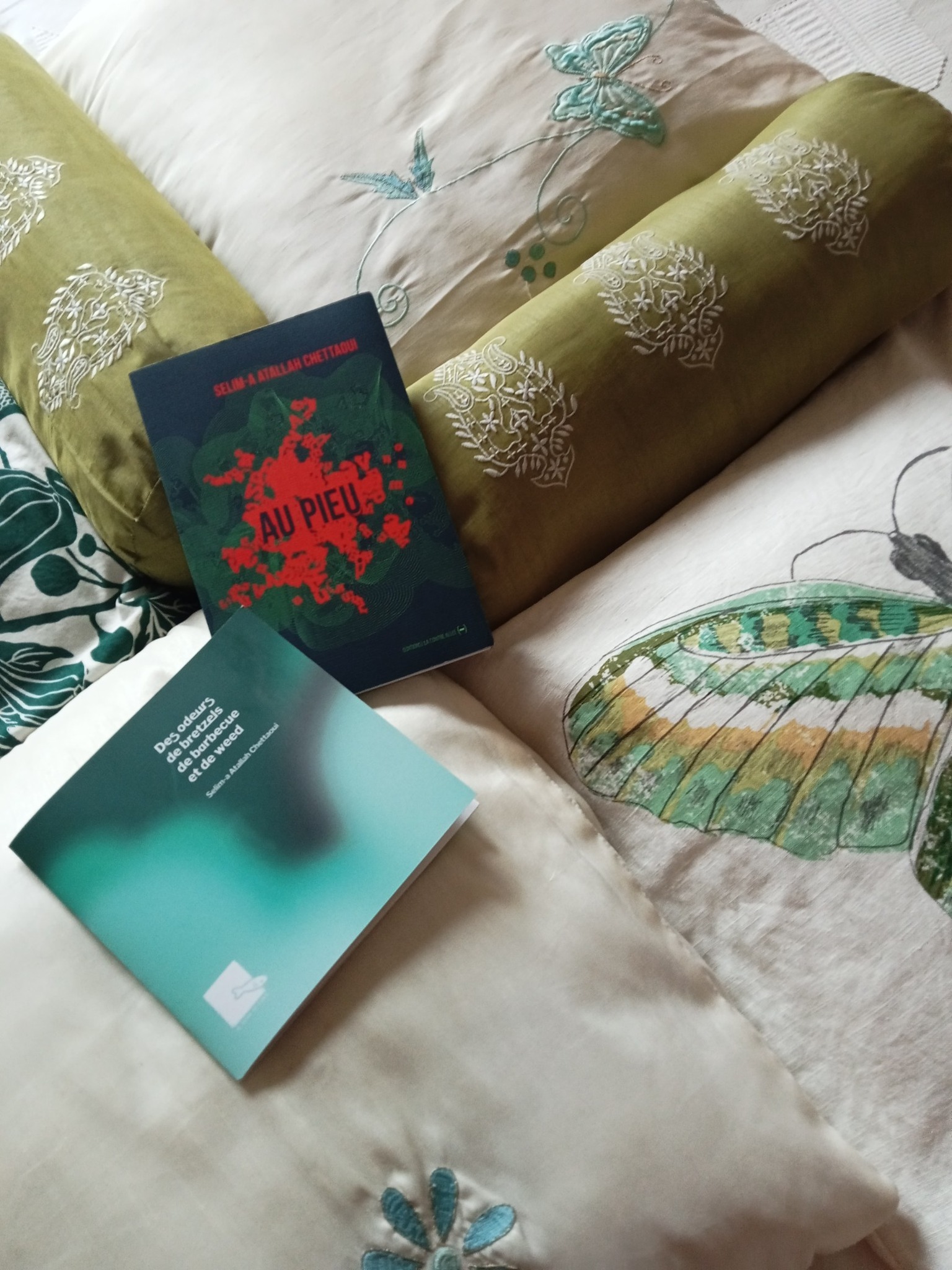 J’ai lu dans un même élan, entre hier et aujourd’hui, Des odeurs de bretzels de barbecue et de weed, premier opus de Selim-a Atallah Chettaoui, publié en 2022 chez 10 pages au carré et Au pieu qui vient de paraître aux Editions de La Contre Allée. Et c’est en effet le mouvement entamé dans le texte publié sur dix pages chez l’incubateur de talents émergents, qui se déploie en poème-fleuve sur la centaine de pages-draps du second recueil.