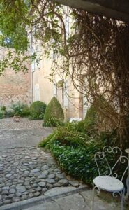 Je partage à présent avec vous des images du lieu majestueux qui a accueilli la journée « Célébrer le vivant » organisée par l’association Journées sorcières samedi dernier. Il s’agit de la superbe Abbaye de Combelongue, de style mudéjar, avec son église toujours consacrée, aux vitraux de style moderne, et ses magnifiques jardins : entre le jardin médiéval et le jardin à la française, Jean-Luc, le gardien et accompagnateur des lieux, a créé et aménagé de multiples espaces de verdure, cachés ou pas, propices à la lenteur, à la rêverie, à la méditation du regard et à la lévitation de la pensée. On les redécouvre à chaque passage, fasciné.e par les petits détails et fantaisies qu’ils nous réservent.