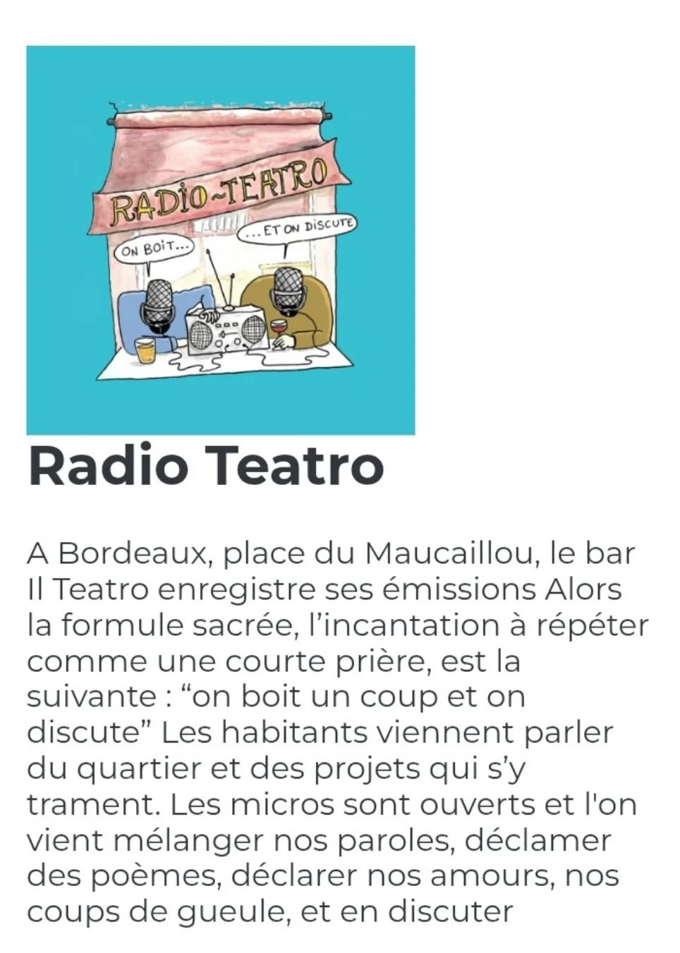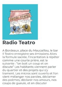 Je ferai partie des invité.e.s de la prochaine session de la toute nouvelle émission Radio Teatro, enregistrée à Il Teatro Bar à Bordeaux
