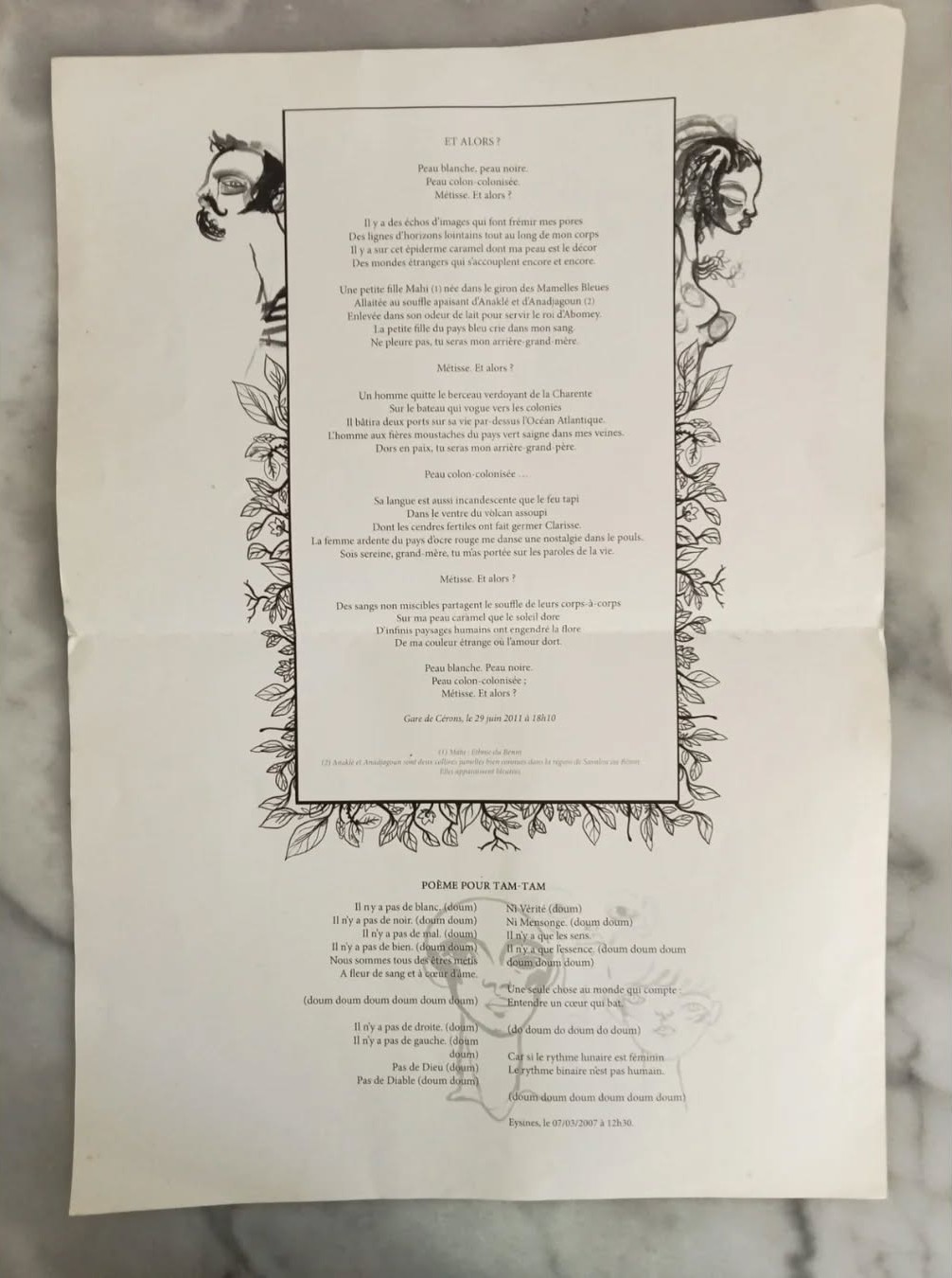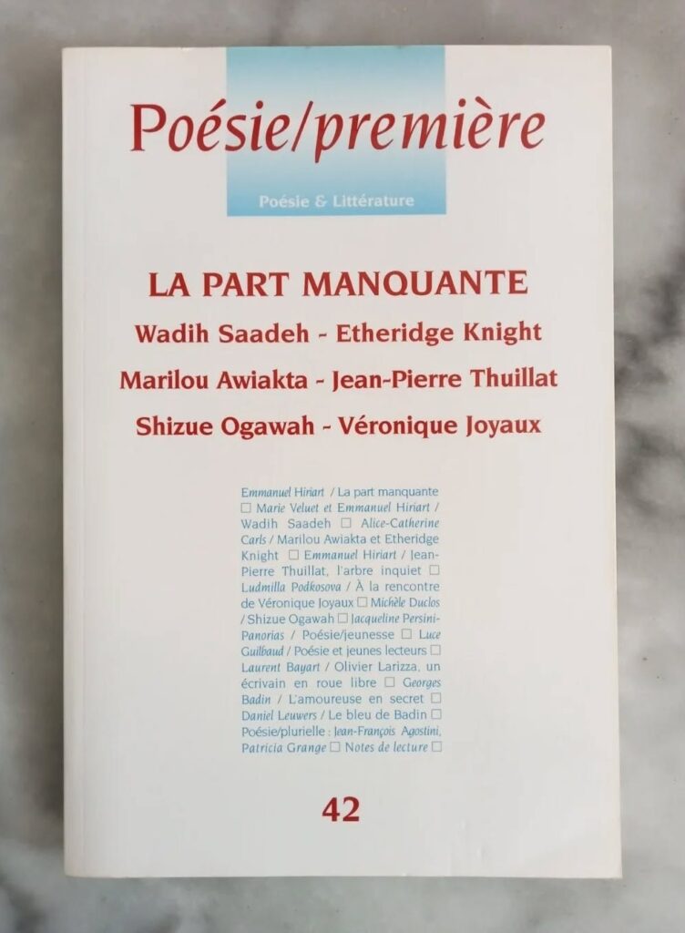 Pour fêter ça, je partage avec vous les premières versions d’un des poèmes qui constituent la colonne vertébrale du recueil, Nid d’ici Née ailleurs. Ce texte a notamment été publié dans le numéro 42 de la revue Poésie/Première (2008) :