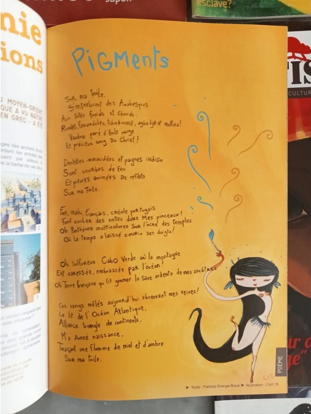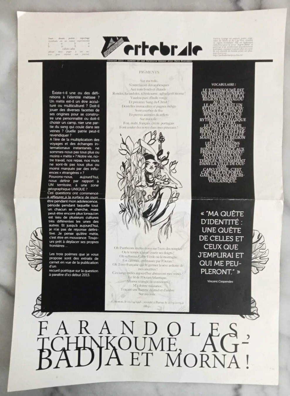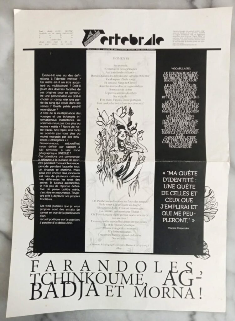 Pigments a eu plusieurs vies, entre autres, dans la revue fanzine affiches Vertébrale de Maya Mihindou, en compagnie de Et alors ? et dans un des numéros de la revue Esprit Métis :