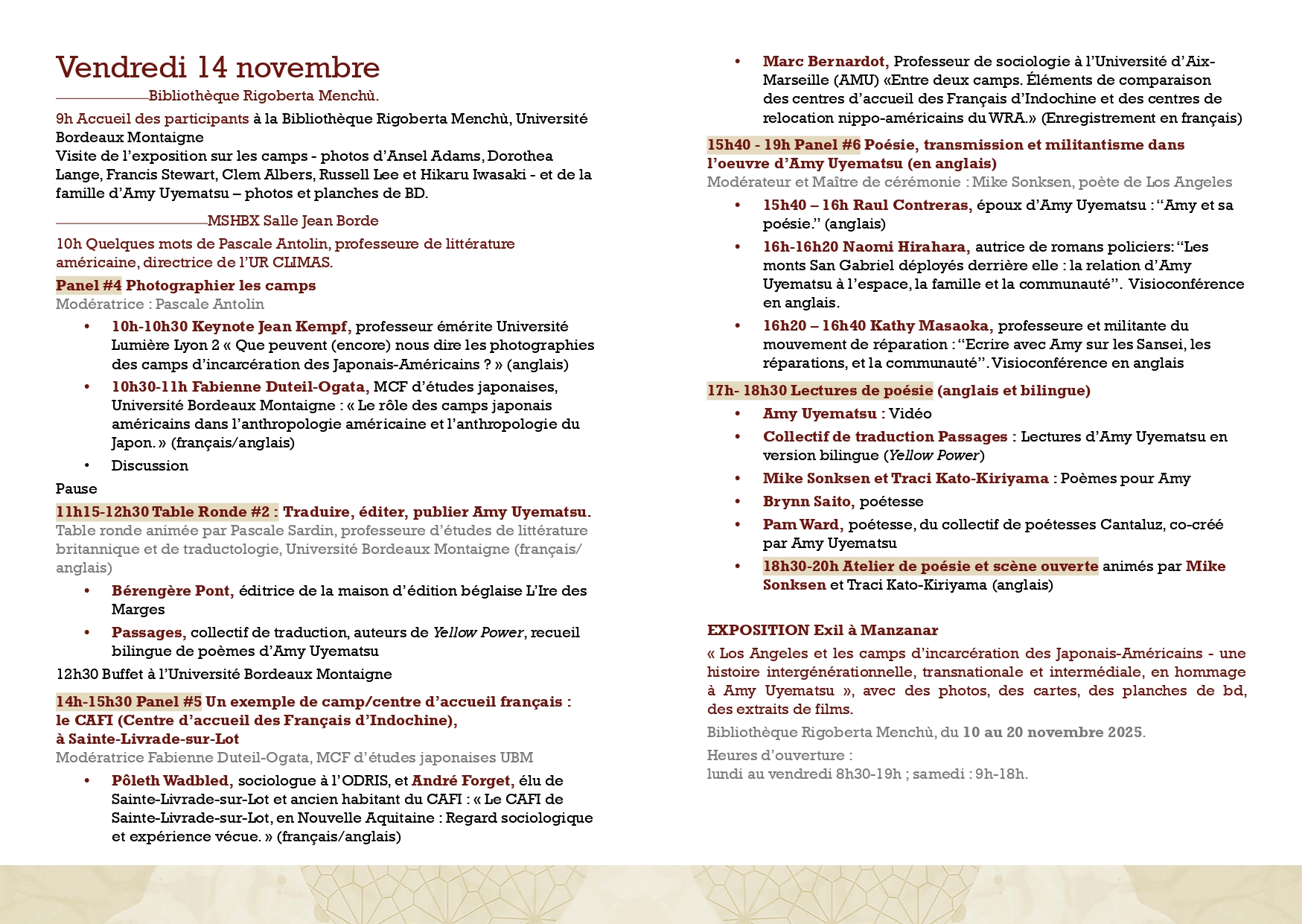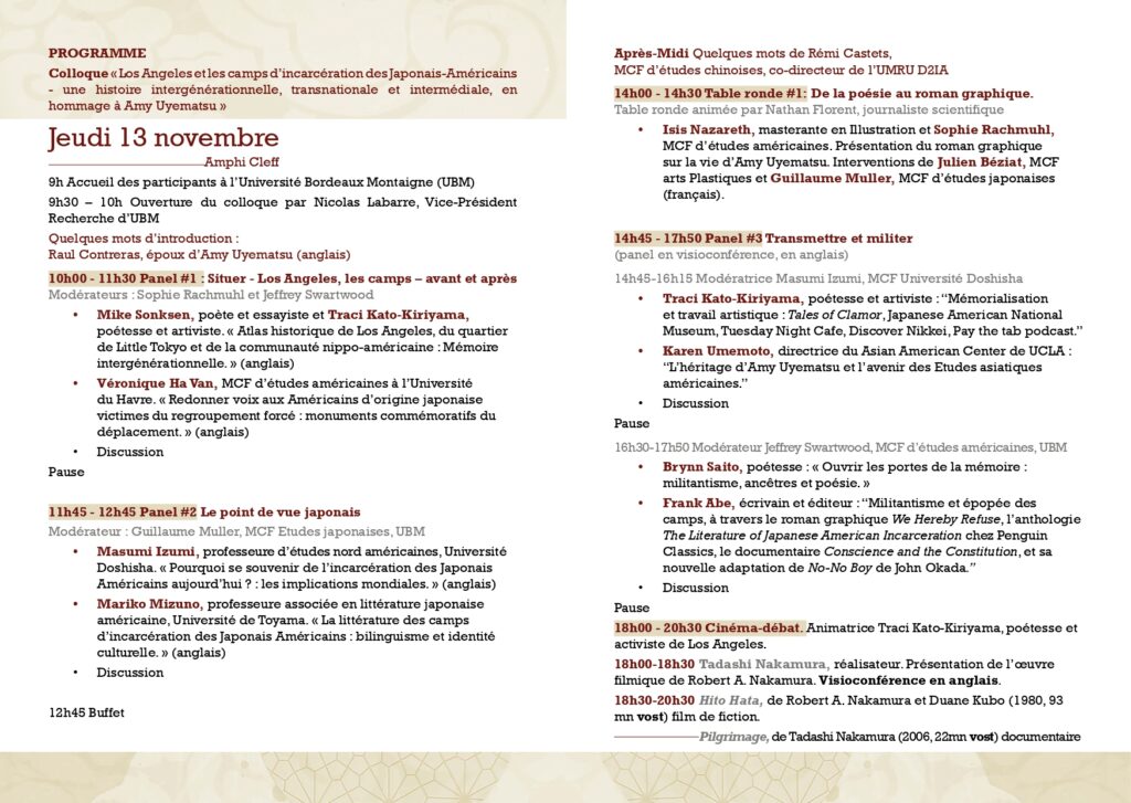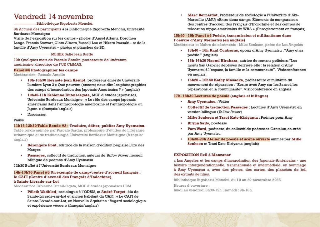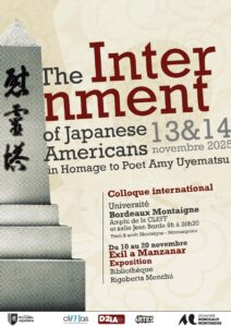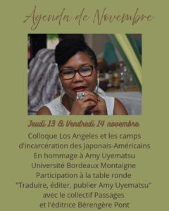 ✨Je vous invite à nous rejoindre lors du colloque « Los Angeles et les camps d’incarcération des Japonais-Américains », organisé les 13 et 14 novembre prochains, en hommage à Amy Uyematsu, par Sophie Rachmuhl et Jeffrey Swartwood. Tous deux font partie de Passages, collectif de traducteurices dont je fais également partie, et avec lequel nous avons traduit une anthologie de la poésie d’Amy Uyematsu, publiée en début d’année par les éditions L’Ire des Marges.