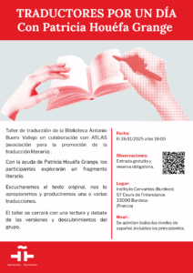 Pour la deuxième année consécutive, j’ai le plaisir d’animer un atelier « Traducteur d’un jour » à l’Instituto Cervantes de Bordeaux en collaboration avec ATLAS, Association pour la promotion de la traduction littéraire. Merci pour la confiance !