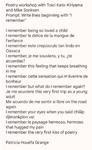 J’étais très heureuse d’y participer avec le collectif Passages qui a traduit une sélection de poèmes d’Amy Uyematsu en français, publiée par L’Ire des Marges. Très émue aussi d’apprendre qu’Amy citait parmi ses influences et poètes préférés, le nom de Lucille Clifton.