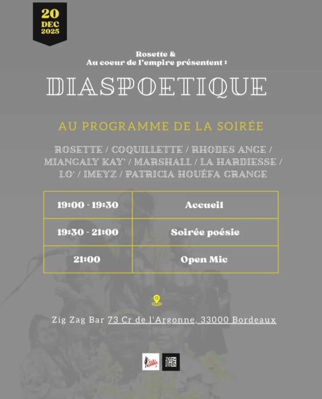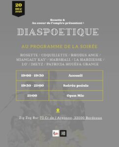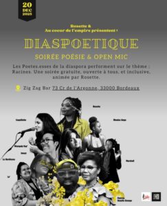Une nouvelle soirée poétique arrive à Bordeaux pour réunir sur scène les voix des diasporas, animée par la talentueuse et fabuleuse Rosette en partenariat avec la radio La Clé des Ondes et l’émission Au Cœur de l’Empire.
