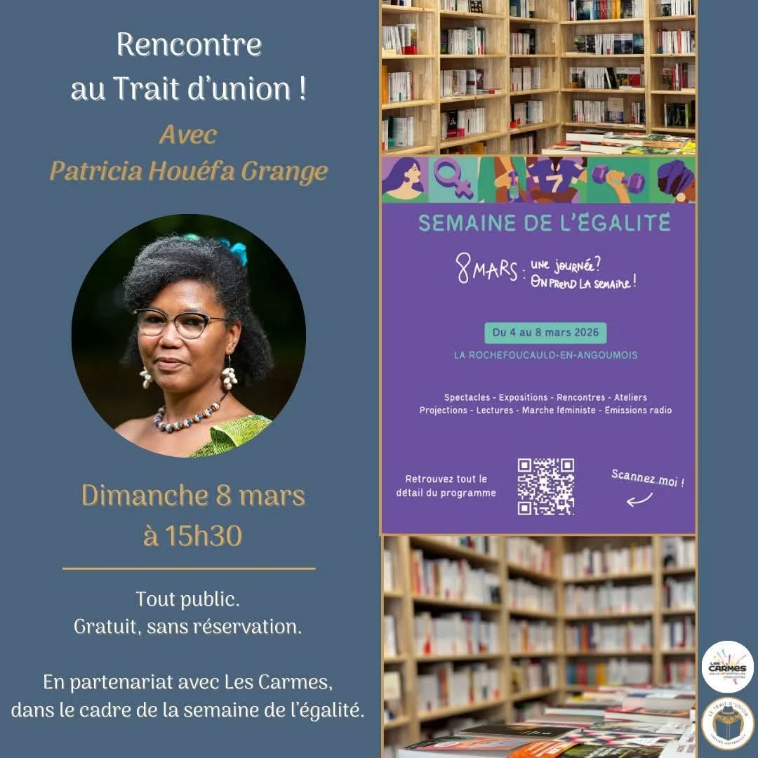 Dans 15 jours tout pile, je passerai l’après-midi avec les lectrices et lecteurs de la librairie Le Trait d’union à La Rochefoucauld, à l’invitation d’Érick-Amaury Zion, dans le cadre de la Semaine de l’égalité et de la journée internationale des droits des femmes.