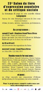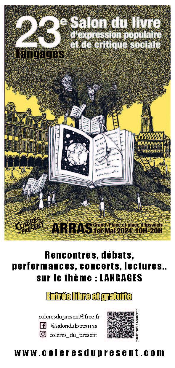 Le 24 avril 2024Je suis très heureuse de participer à « Colères du Présent » Salon du livre d’expression populaire et de critique sociale le 1er mai prochain sur la Grand’Place d’Arras.
